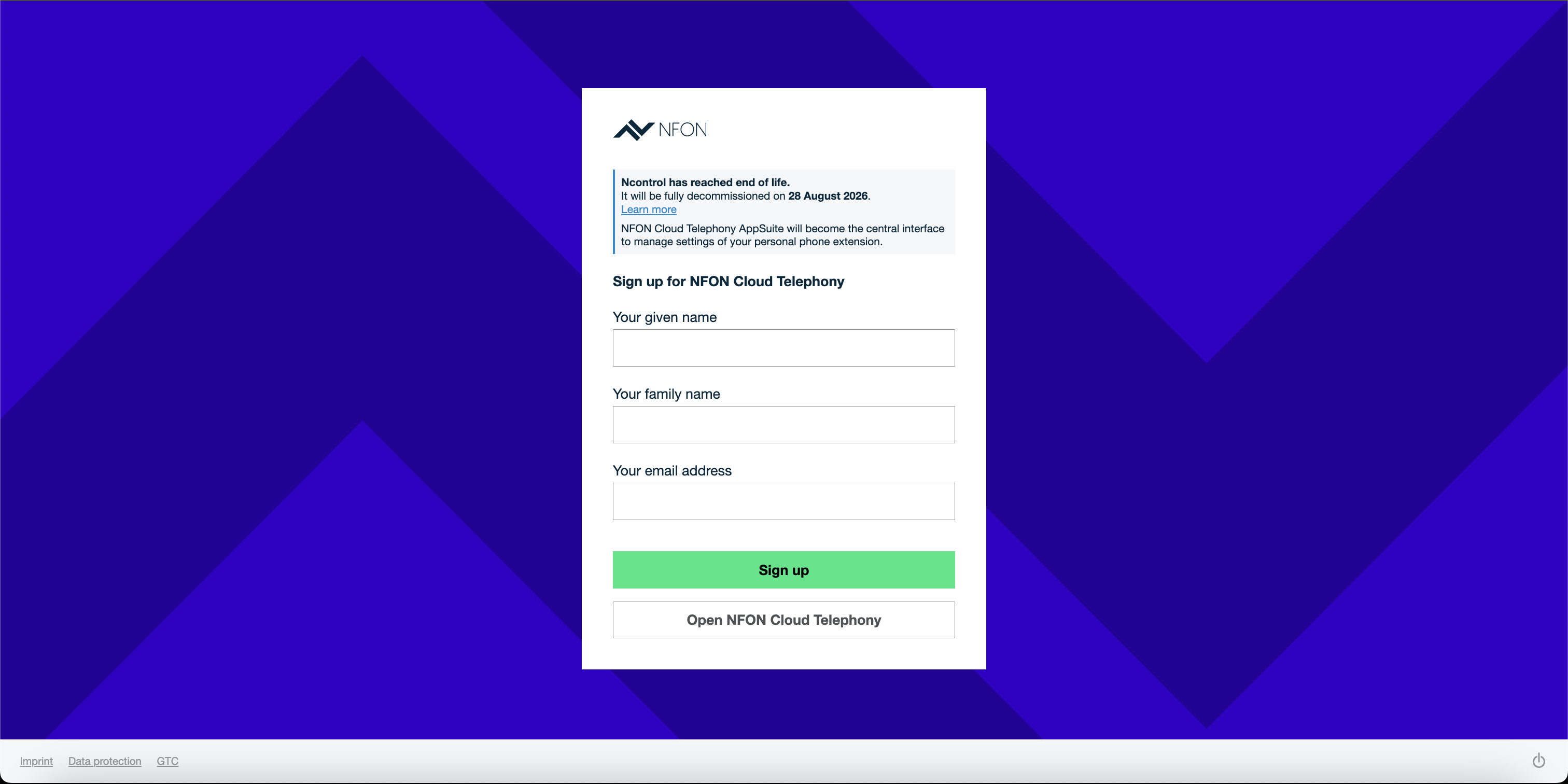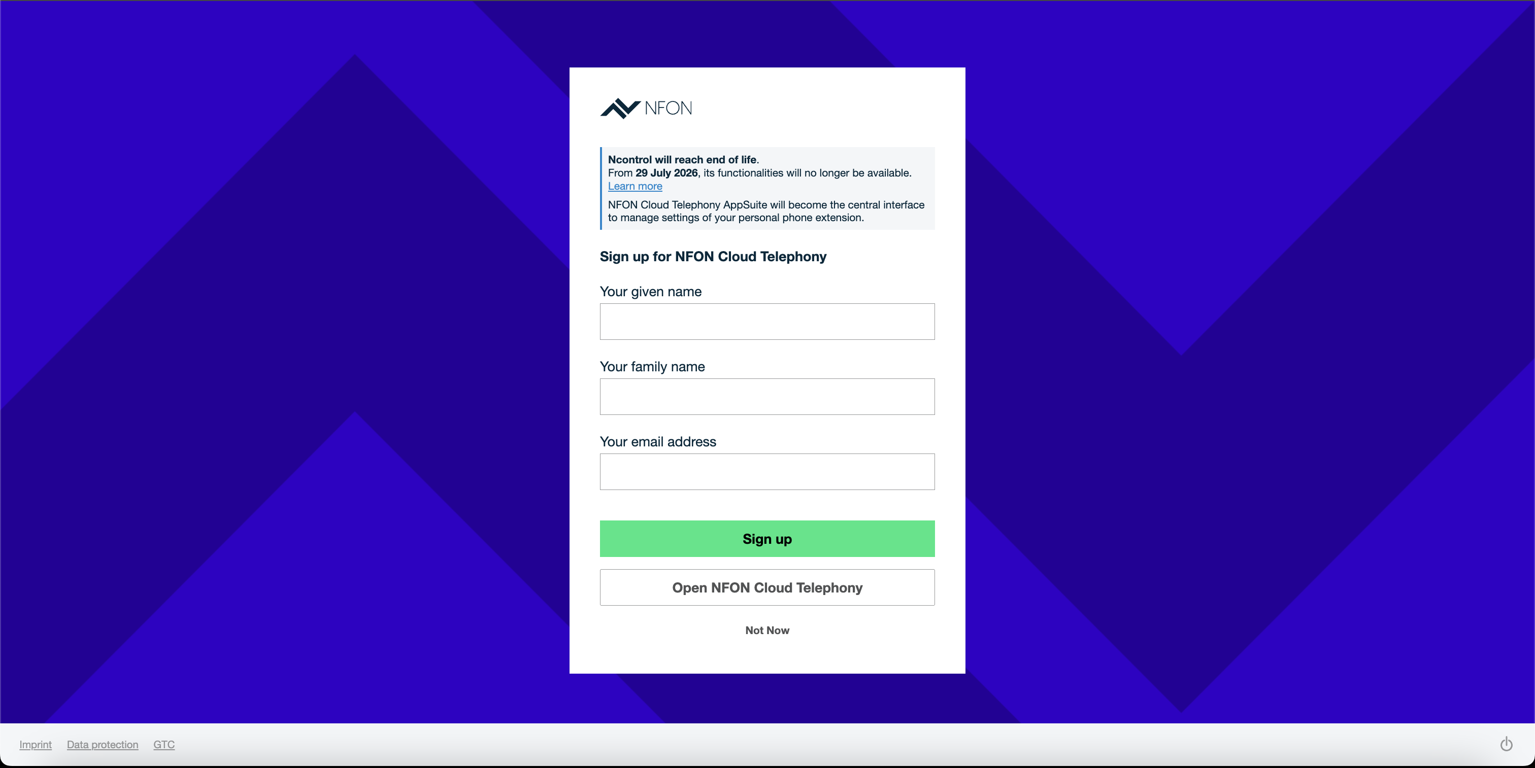 After Ncontrol is decommissioned, you will no longer be able to create a user yourself. Please contact your cloud telephony administrator to obtain a user account for your extension.